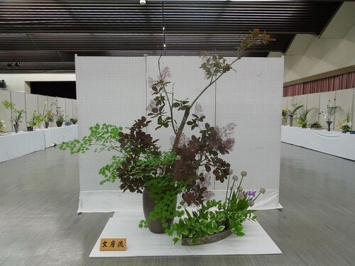 ★越前市華茶道連盟の支部会員の作品。5月23日24日市民ホール 於 大作・・スモークツリー・かえで・・なるこゆり・白花シラン・ギガンジュウム・紫ラン